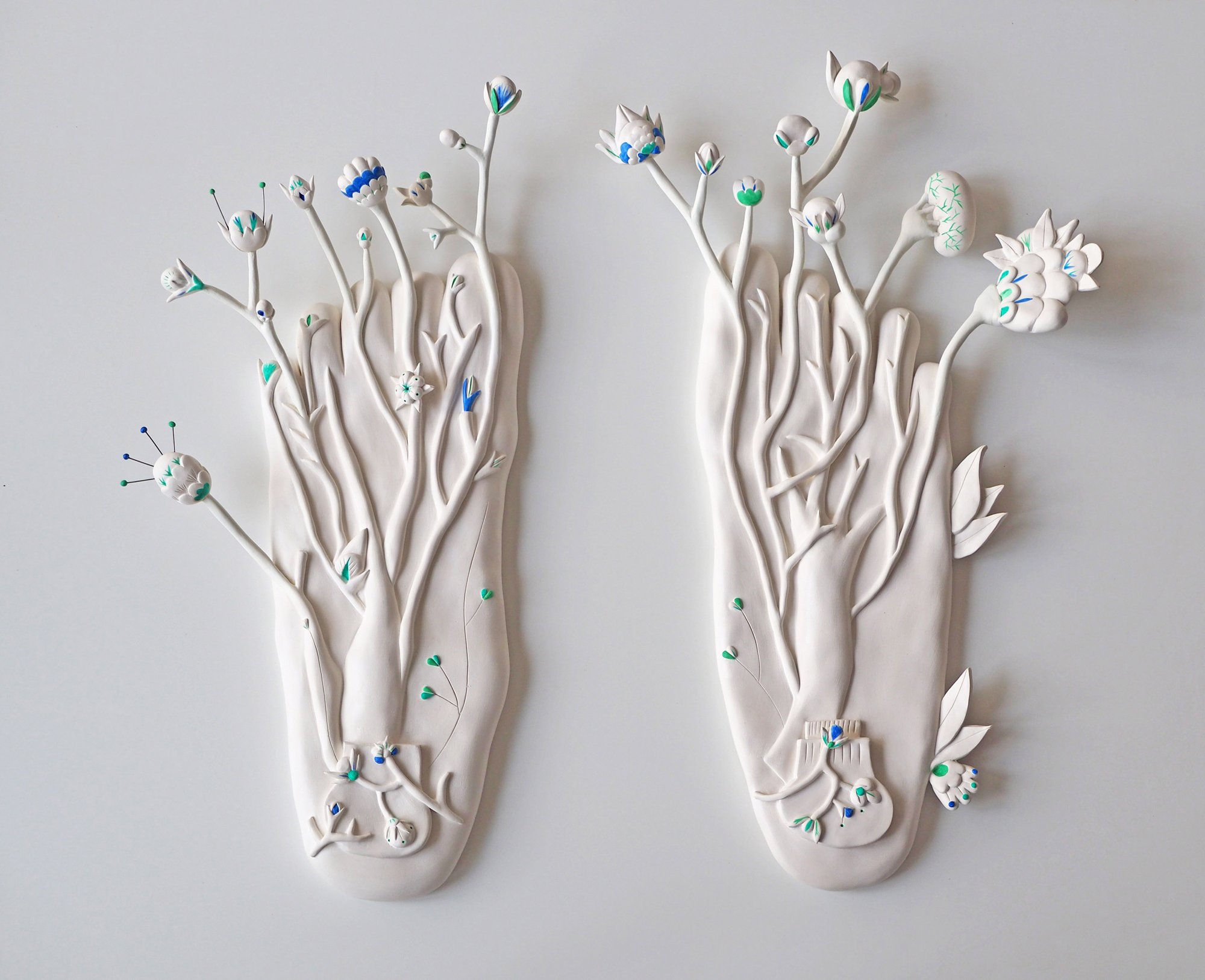 « L’Herbier Anatomique » révèle la proximité originelle et formelle de l’Homme avec la Nature. Dans cet herbier mi-humain mi- végétal, je mêle et confonds des fragments de corps et des éléments végétaux. Je m’inspire de planches anatomiques représentant les systèmes nerveux et musculaire. Les muscles se transforment en tiges fertiles. Les doigts voient éclore en leurs bouts des fleurs hybrides. La flore envahie ces organes comme si elle reprenait ses droits. Entre force et fragilité, cet herbier fait ressortir cette dualité existante dans le monde vivant. Ces organes « en fleurs » nous rappellent que les lignes intérieures de notre corps sont proches des formes présentent dans la nature et que nous faisons partie d’un même Tout. Ces formes extraites d’une nature stylisée et fantasmée tendent à révéler sa beauté à la fois puissante, éphémère et fragile. Avec cette série d’herbiers, je cherche à révéler ce qui nous échappe afin de rendre palpable le caractère sacré et précieux de la Nature et de la Vie sur Terre.